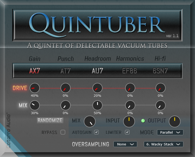 Quintuber is an emulation of five popular vacuum tubes found in many types of audio electronics each known for their unique tone and distortion characteristics. These can be used one at a time or dialed in freely for all five tubes thanks to the plugin's flexible parallel processing. An unyielding serial processing mode is also available where each tube's output is fed into the next one.